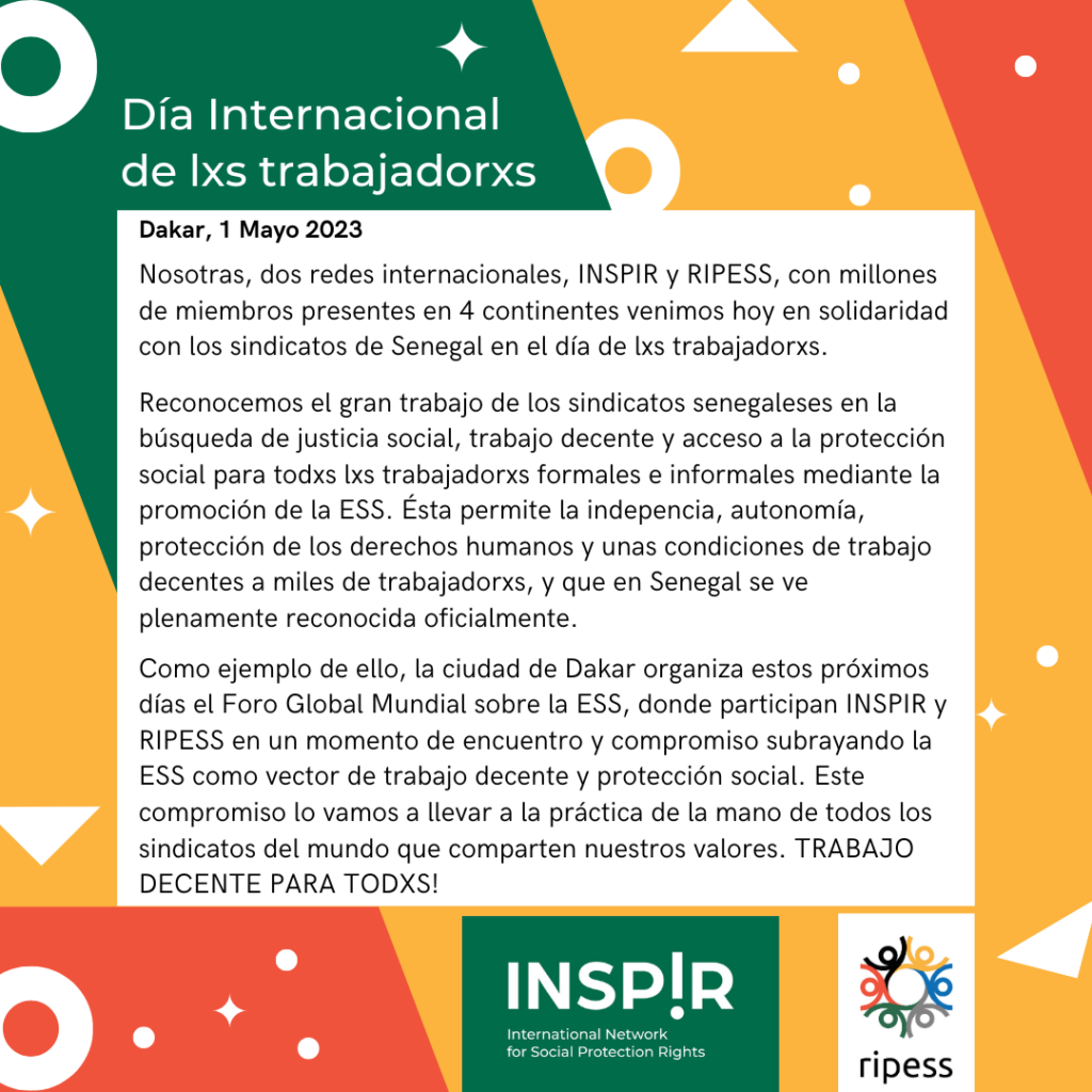 WSM y RIPESS se complementan en la promoción de derechos laborales, equidad social y transición socioecológica. El pasado 1 de mayo de 2023 lanzamos un comunicado desde Dakar, Senegal junto con INSP!R. Esta rama específica de WSM está enfocada en la protección social y está formada por cerca de 100 movimientos sociales en 24 países de África, América Latina, Asia y Bélgica que WSM unió. Estos diferentes actores se complementan y comparten todos la misma visión y los mismos objetivos uniendo fuerzas desde la sociedad civil en la red global INSP!R, la Red internacional por el derecho a la protección social. ,