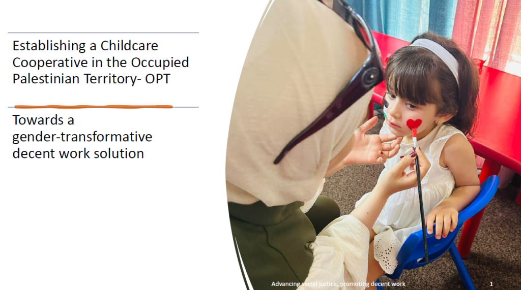 Mohanad Shalabi, responsable national des projets de l’Organisation Internationale du Travail (OIT) à Jérusalem et du bureau de Ramallah pour les Territoires Palestiniens Occupés (TPO), a présenté le travail de l’OIT ainsi que l’initiative, en anglais, « Fournir des soins coopératifs comme une solution transformatrice en matière de genre pour un travail décent« . L’objectif est d’explorer la viabilité des coopératives et d’autres entités de l’économie sociale et solidaire comme modèle permettant d’offrir des services de Soins à l’enfance abordables, accessibles et de qualité, tout en favorisant l’autonomisation économique des femmes et en contribuant au bien-être social dans les TPO.