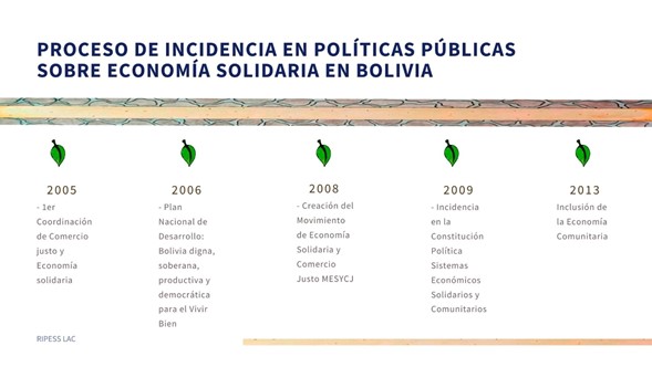 - Incidencia en nueva Constitución Política del Estado (2009), el país viene transitando un proceso de diferentes reformas institucionales, políticas y culturales. En el plano económico los avances normativos habilitan el paso hacia el fortalecimiento de sistemas solidarios y comunitarios de organización económica, a nivel micro y macro, para propender hacia una nueva relación más democrática y equilibrada entre sociedad, Estado y mercado.