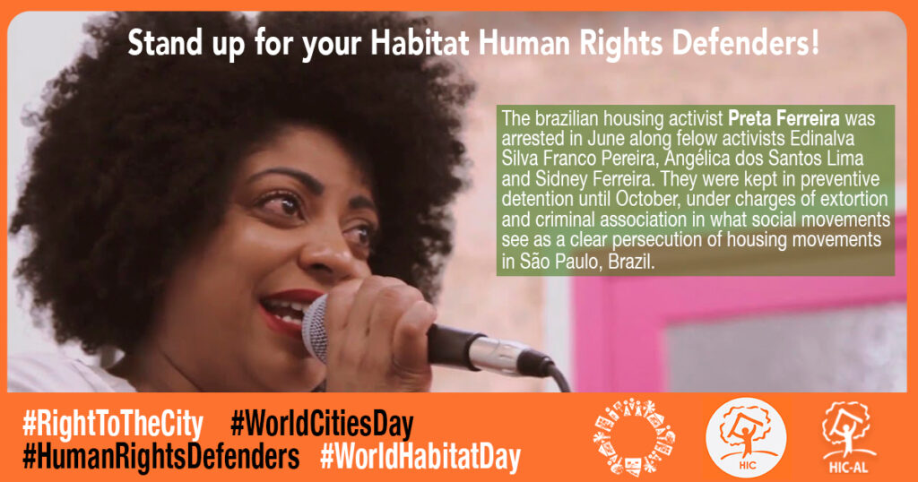 Ces dernières années, la lutte pour les Droits Humains liés à l’habitat a été la cause de persécutions et de criminalisation par des forces puissantes qui traitent la terre, le logement et la ville comme des marchandises. Ce refoulement mondial contre les Droits Humains c’est fait sentir avec une violence particulière contre les défenseurs des Droits Humains et les mouvements sociaux qui sont à l’avant-garde des luttes pour ces droits liés à l’habitat.