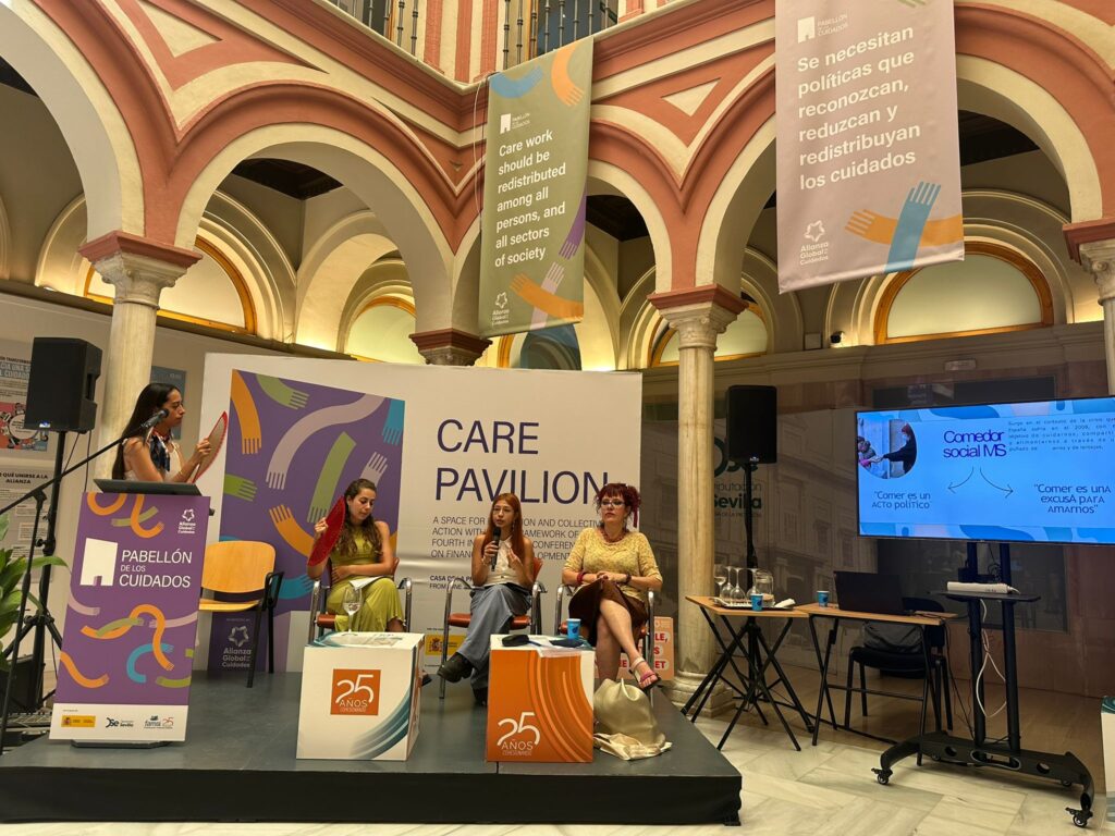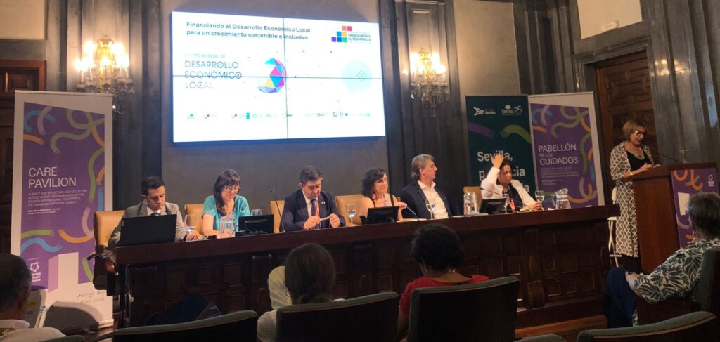 En tant que nouveau membre de l’Alliance mondiale pour les soins, RIPESS était également présent au Pavillon des soins, dans la Casa de la Provincia, ancien siège de la Conseil provincial de Séville. L’Alliance mondiale pour les soins a promu le Pavillon avec le soutien du ministère espagnol de l’Égalité, du àConseil provincial de Séville et du Fonds andalou des municipalités pour la solidarité internationale (FAMSI). Ce fut un espace central pour la réflexion, le dialogue, le plaidoyer politique et la coordination des efforts visant à faire du financement des soins une priorité structurelle dans les agendas de développement économique et social à l’échelle mondiale. Nous avons été invités à débattre des éléments les plus pertinents de l’ESS lors de l’événement « Financement du développement économique local pour une croissance durable et inclusive », aux côtés de Mme María Guijarro, secrétaire d’État à l’Égalité du gouvernement espagnol ; M. Francisco Reyes, président du FAMSI ; M. Iñigo Arbiol, sous-directeur du Secrétariat de la Coalition locale 2030 ; et Mme Ana B. Moreno, secrétaire technique de l’Alliance mondiale pour les soins. L’événement avait pour objectif de contribuer à l’ODD 4, en réaffirmant le rôle essentiel des territoires dans la réalisation des objectifs de développement mondial et en mettant l’accent sur les soins comme axe transformateur du modèle économique et social. Reconnaître le travail de soins, rémunéré ou non, comme une composante centrale du développement économique local implique d’avancer vers une économie plus équitable, inclusive et centrée sur les personnes.