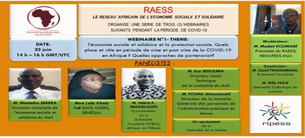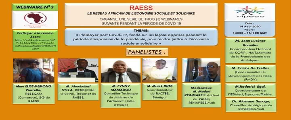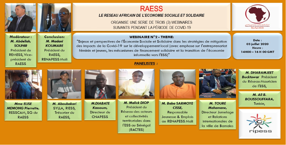 Pour y parvenir, le RAESS, avec l’appui de la Coordination internationale du RIPESS a animé plusieurs webinaires thématiques avec des intervenants provenant de plusieurs secteur socioprofessionnels et institutionnels d’Afrique et d’ailleurs.