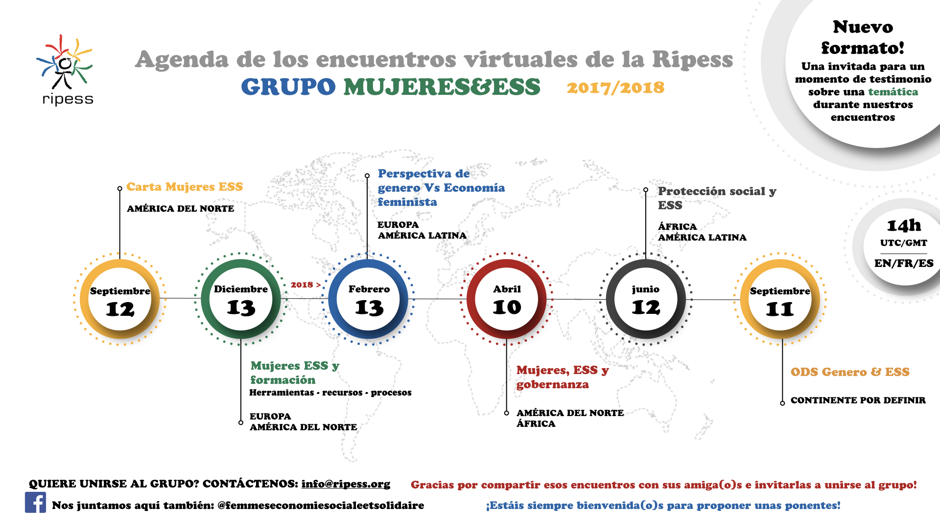 Hasta ahora principalmente abierto a los miembros y redes de la RIPESS, queremos en adelante abrirlo más ampliamente a todas y todos que estén interesada(o)s ​​en este tema. Es por esto que hemos programado un calendario anual de reuniones en 2017 y 2018 en el cual proponemos el testimonio de una(o)s experta(o)s sobre temas de interés identificados por nuestro grupo, y así crear un verdadero espacio de intercambio internacional. Tenga en cuenta que las reuniones se realizan en los tres idiomas de la RIPESS (francés, inglés, español).