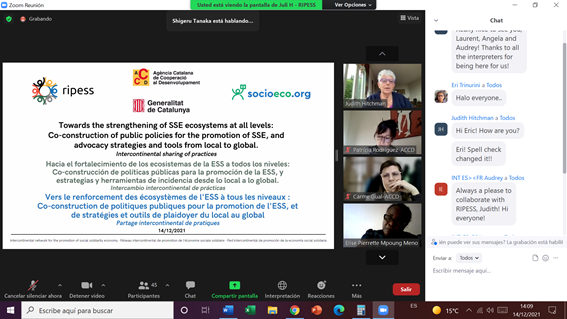On Tuesday 14th of December, RIPESS members and other SSE actors from around the world got together to exchange on advocacy strategies and collaboration with local, national and international policymakers for co-constructing public policies to strengthen SSE ecosystems around the world. The Director of the Catalan Agency for Development Cooperation, Carme Gual, together with Shigeru Tanaka, joint-coordinator of RIPESS, officially welcomed the participants at the opening of the webinar